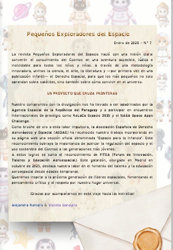 Pequeños Exploradores del Espacio, en colaboración con Violeta Gandullo (desde España), es una propuesta pensada para niñas y niños. Busca despertar la curiosidad sobre el universo, combinando datos astronómicos con narrativa, fantasía e ilustración. Más que una revista, es una experiencia sensorial que fusiona ciencia y arte. También contamos con la colaboración de Enrique Javier Peña Salinas (desde Honduras), en la parte de actividades, y con autores de distintos países de Latinoamérica en la sección literaria.